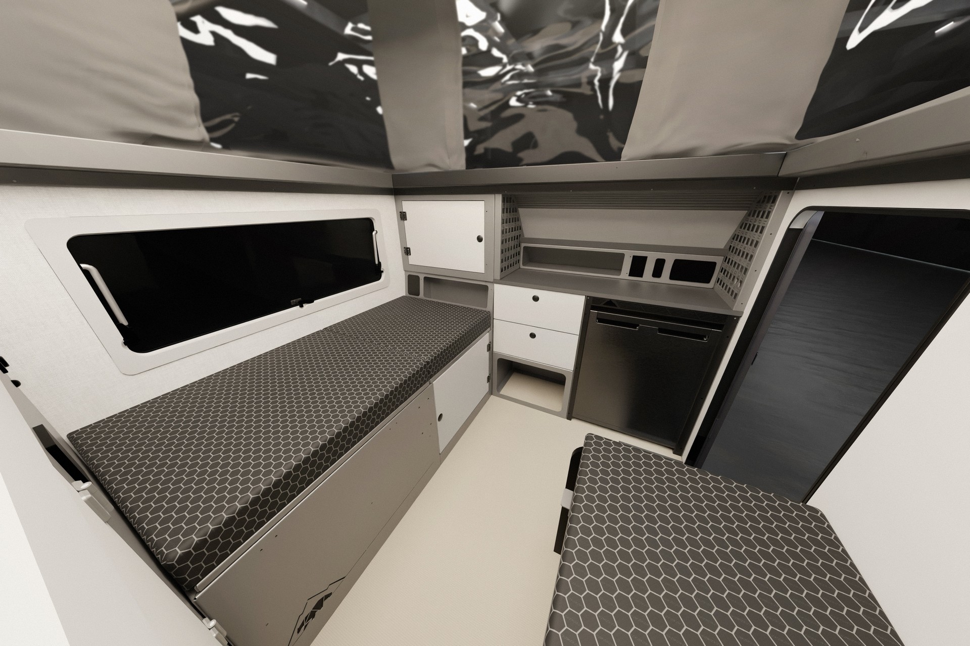 It’s smaller in size, but Arkto has worked to incorporate most of the G12’s features into the C10. That includes the company’s sliding outdoor kitchen with a 10-cubic-foot pantry, dual-burner stove, prep table, and hot- and cold-water sink. There’s also a fridge, though, that’s mounted inside and not out.
