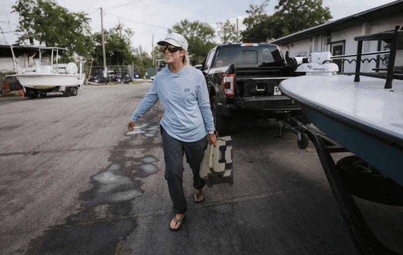 Her infectious, rumbling laugh rings out across the boat launch, but she doesn’t need that to identify her — how many other 5’0” blonde female captains do you see ripping around in a flat skiff guiding saltwater fishing trips, or hauling out their DECKED gear cases full of rods and lures at zero-dark-thirty?