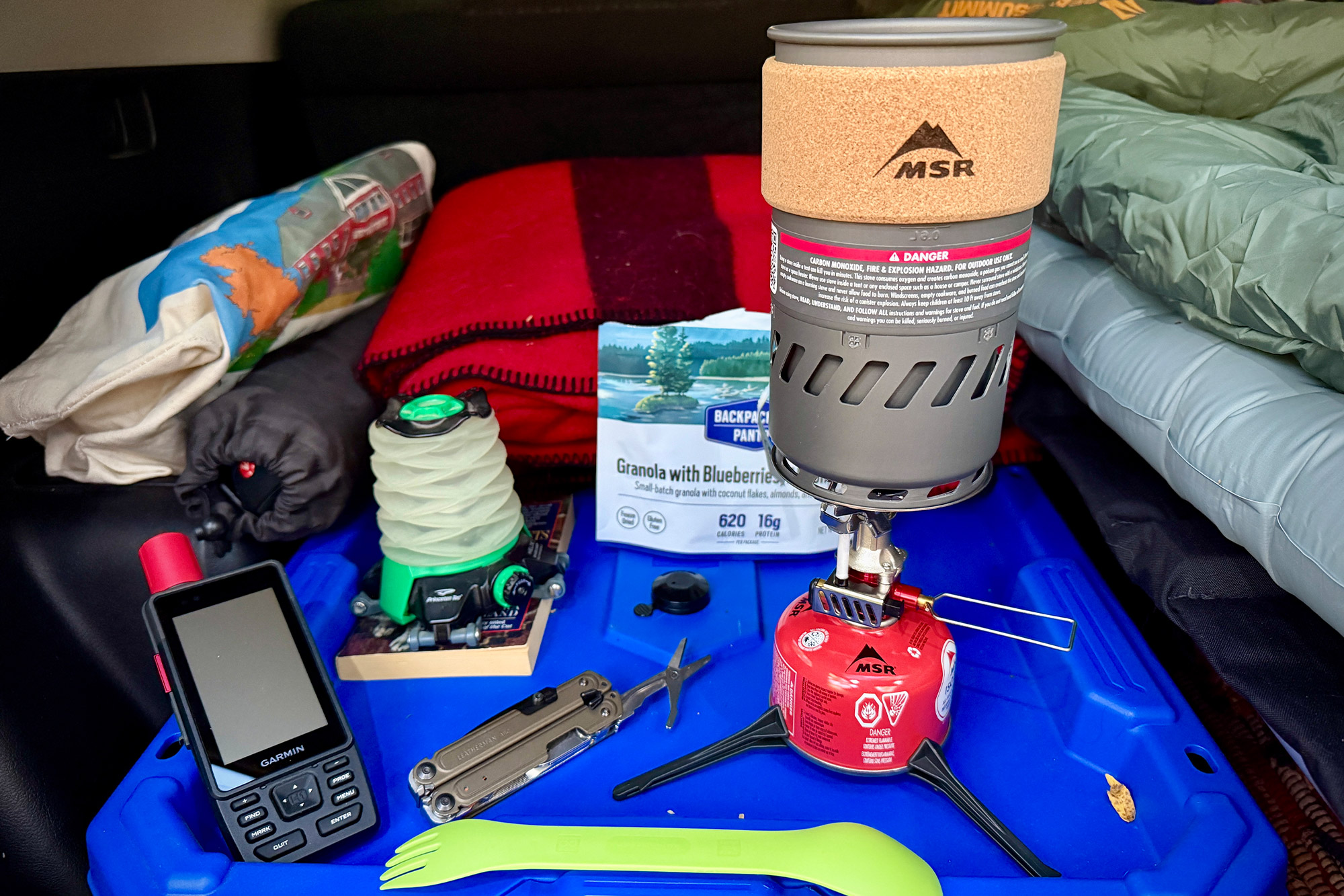 The MSR Switch boils water inside a car setup with blankets and gear packed for camping(Photo/Nick LeFort)